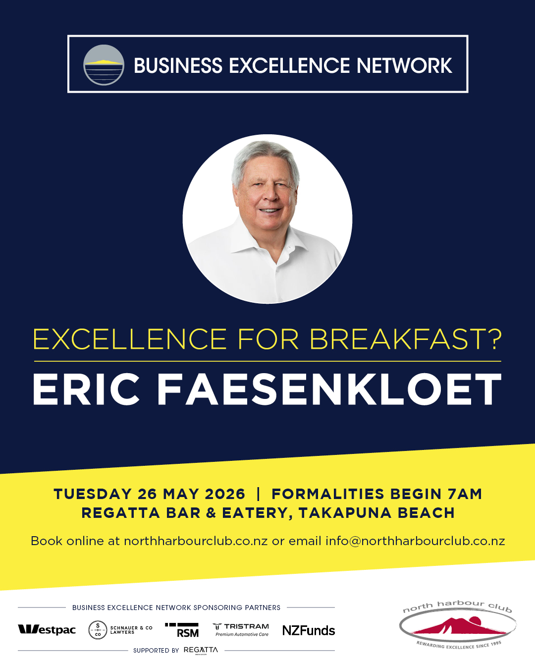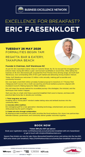 Start your morning with inspiration and insight at the BEN Breakfast on Tuesday, 26 May 2026 at Regatta Bar & Eatery, Takapuna Beach. Hear Eric Faesenkloet share his incredible journey—from building Golf Warehouse into a market leader to leading bold projects that shape Auckland’s future. Enjoy a gourmet breakfast, connect with North Shore business leaders, and take away practical strategies to elevate your own success.